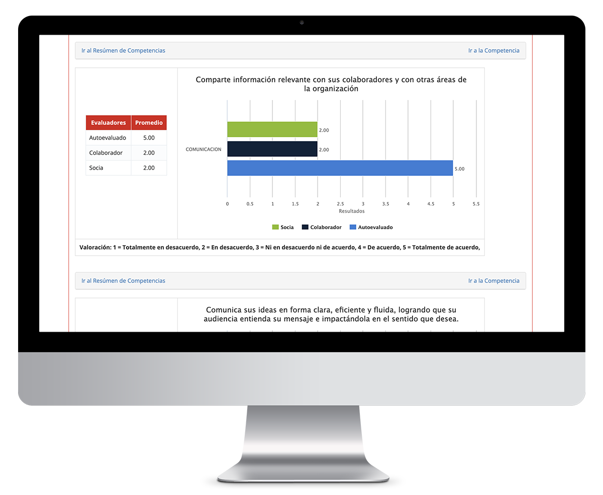 Gráficas y resultados claros para comprender de forma inmediata el desempeño evaluado.